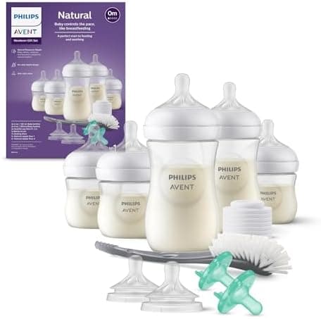 A perfect starter set for new parents. Philips Avent Natural bottles with Natural Response nipple lets baby control the pace of the milk, like they do when breastfeeding. The nipples' unique opening and tip only releases milk when your baby actively drinks. When pausing to swallow and breathe no milk flows. Baby can drink, swallow, and breathe using their natural rhythm, just like they do when breastfeeding. Easily combine breast and bottle feeding with a wide breast-shaped nipple with a soft feel that mimics the shape and feel of a breast; plus baby controlling the flow of milk. A bottle brush with a curved brush head for easy cleaning of rounded bottle edges and a molded tip to clean the nipple. Sealing discs to covert the bottle into a storage container. Soothie 0-3M pacifier, Soothie Pacifiers are used by medical professionals to calm newborns, the durable pacifiers features hospital grade silicone and one piece construction. The Natural bottle is made from polypropylene, a BPA free material, and works with all nipples and caps from the Natural line. The Natural response nipples come in flow rates 1-5. Includes: 3 4oz Natural bottles with Natural response nipples flow 2, 2 9oz Natural bottles with Natural response nipples flow 3, 1 Natural Response nipple, flow 1, 1 Natural Response nipple, flow 4, 7 sealing discs, 2 Soothie pacifiers 0-3 months, 1 bottle brush. SCD838/02 What to expect when introducing the Philips Avent Natural Response Nipple It is totally natural for your baby to take 2-3 tries to get milk flowing from a new bottle. Unlike traditional bottles the Natural bottle is designed to only release milk when your baby is actively drinking, like what happens when babies breastfeed. We have 5 different nipple flow rates for the Natural bottle. When looking for the right nipple flow rate, age is a guide, but your baby's approach to drinking and the feeding cues they will show will help determine when to move to a higher or lower nipple flow rate.