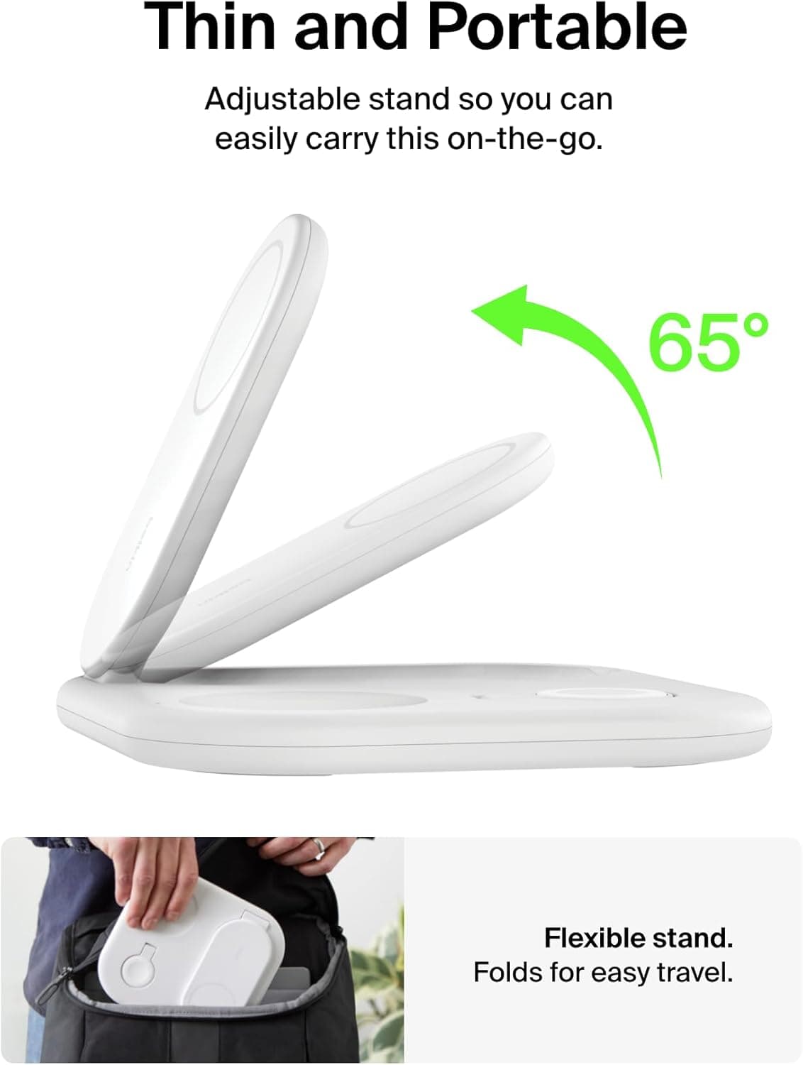 The Belkin BoostCharge 3-in-1 Magnetic Foldable Charger lets you fast charge your iPhone or Qi2 compatible device up to 15W. Its Qi2 technology also optimizes energy usage and safeguards the device's battery life. MagSafe-compatible, this versatile charger makes powering your iPhone easier than ever – ensuring proper placement with a simple 'click' in place. Plus, you can charge your AirPods and Apple Watch at the same time. The upgraded fast charging watch puck charges Apple Watch Series 9, 8, and 7 Ultra and Ultra 2 from 0-80% in 45 minutes.† Purchase yours with peace of mind, as it comes with a 2-year warranty and $2,500 Connected Equipment Warranty (CEW). *Based on internal testing. Belkin Qi2 15W wireless charger charges iPhone 15 from 0-50% up to 2x faster than a Qi 5W wireless charger and up to 1.5x faster than a Qi 7.5W wireless charger. Charge time varies with environmental factors; results may vary. **Housing (excluding cable and power supply) is made of a minimum of 75% post-consumer recycled plastic. †Data based on internal lab testing. This stand recharges Apple Watch Series 9 from 0-80% in 45 minutes. Actual results will vary depending on varying factors, including device age, model and usage environment, for individual users. Belkin is an established accessories market leader creating high-quality, innovative tech solutions for 40 years. Specifications: 15W fast charging – Qi2 MPP certified Fast charging C962 Apple Watch puck (compatible with all first party builds) 5W BPP Qi pad Universal compatibility for most PD3.1 (EPR) / PD3.0 enabled devices, including: iPhones and Qi2 compatible devices such as iPhone 16 Series, iPhone 15 Series, iPhone 14 Series, iPhone 13 Series, iPhone 12 Series, and more PCR materials, 100% plastic-free packaging 2-year warranty $2,500 CEW Package Includes: BoostCharge 3-in-1 Magnetic Foldable Charger 36W USB-C PSU