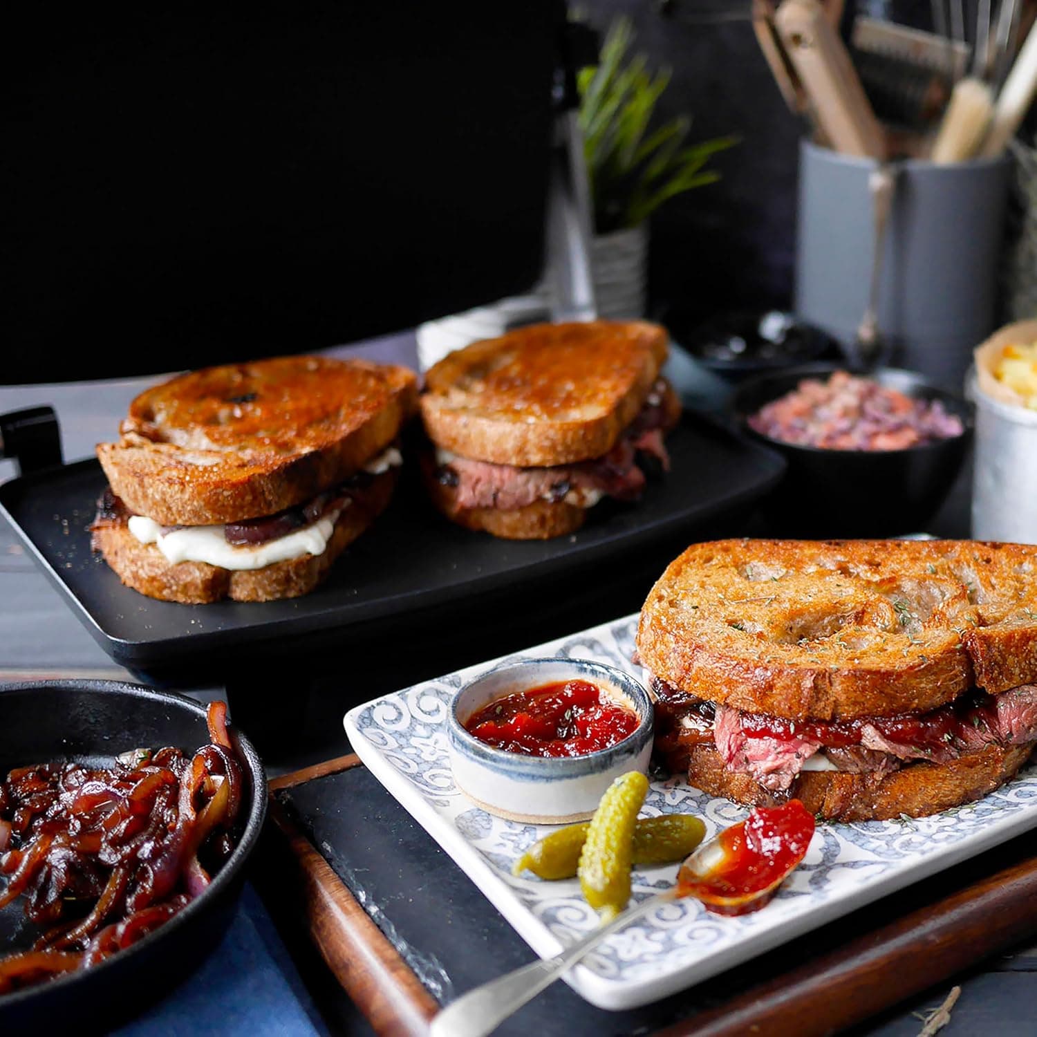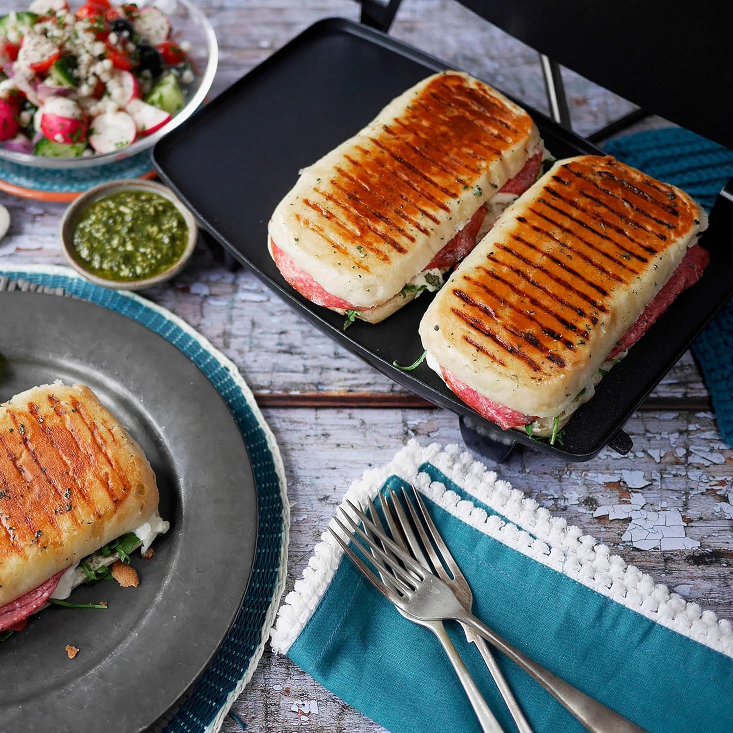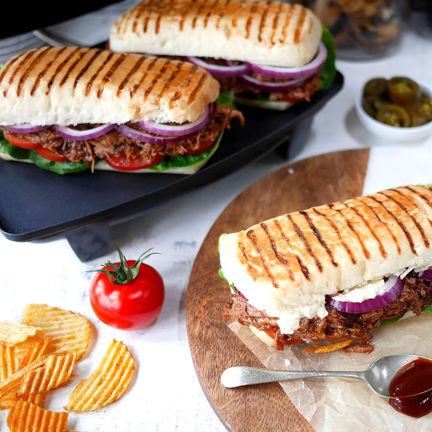 מכבש פניני רב - תכליתי עם 3 פרוסות עם פלטה עליונה צפה, פלטות שאינן דביקות ואחסון זקוף. אידיאלי להרמת כוסית כריכים, ג'בטה, לחמניות ועוד.