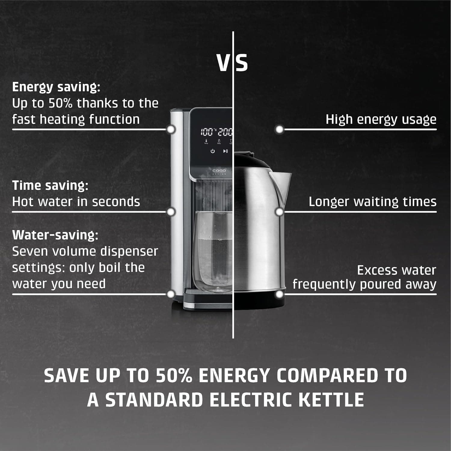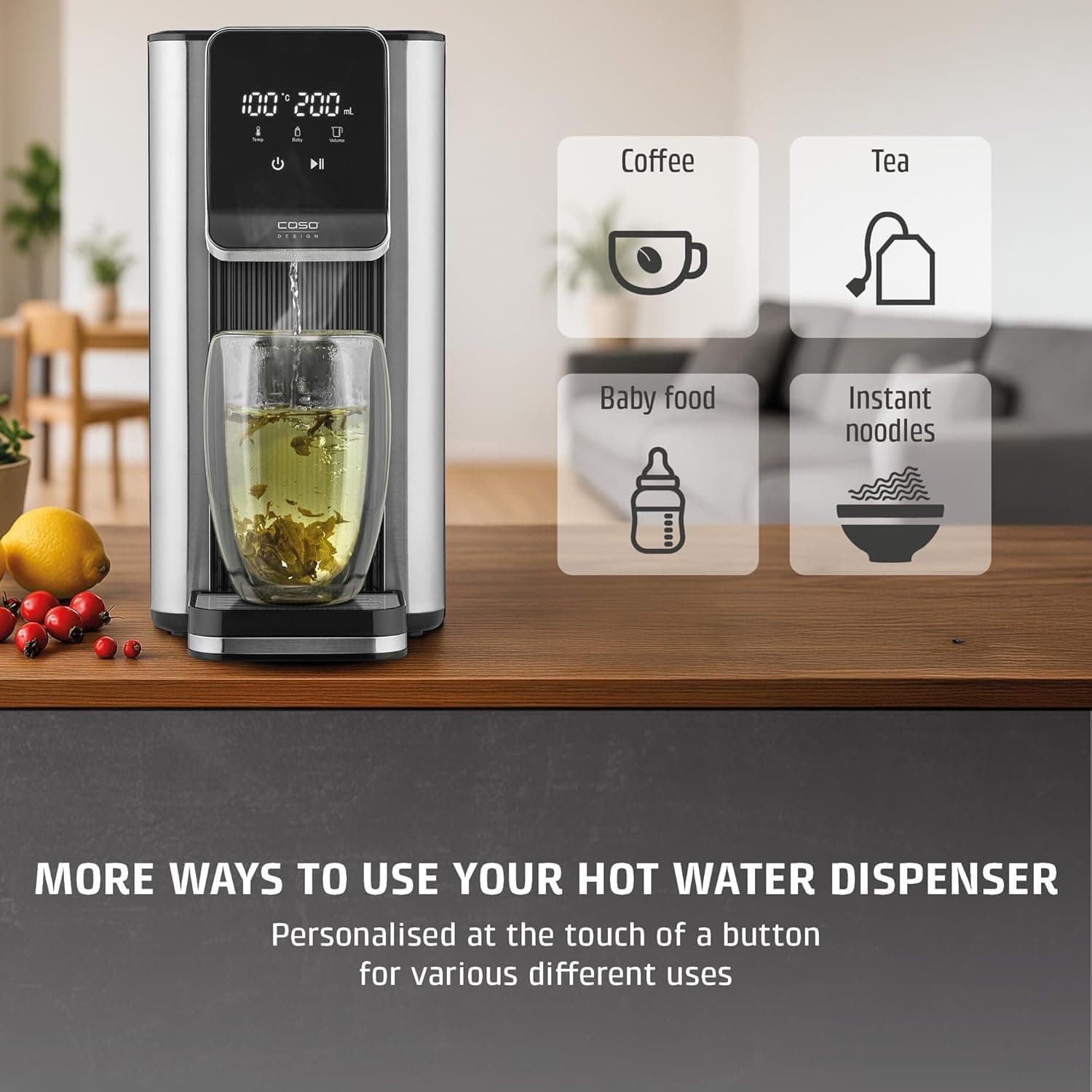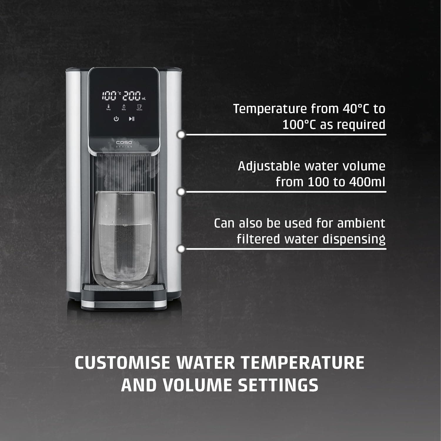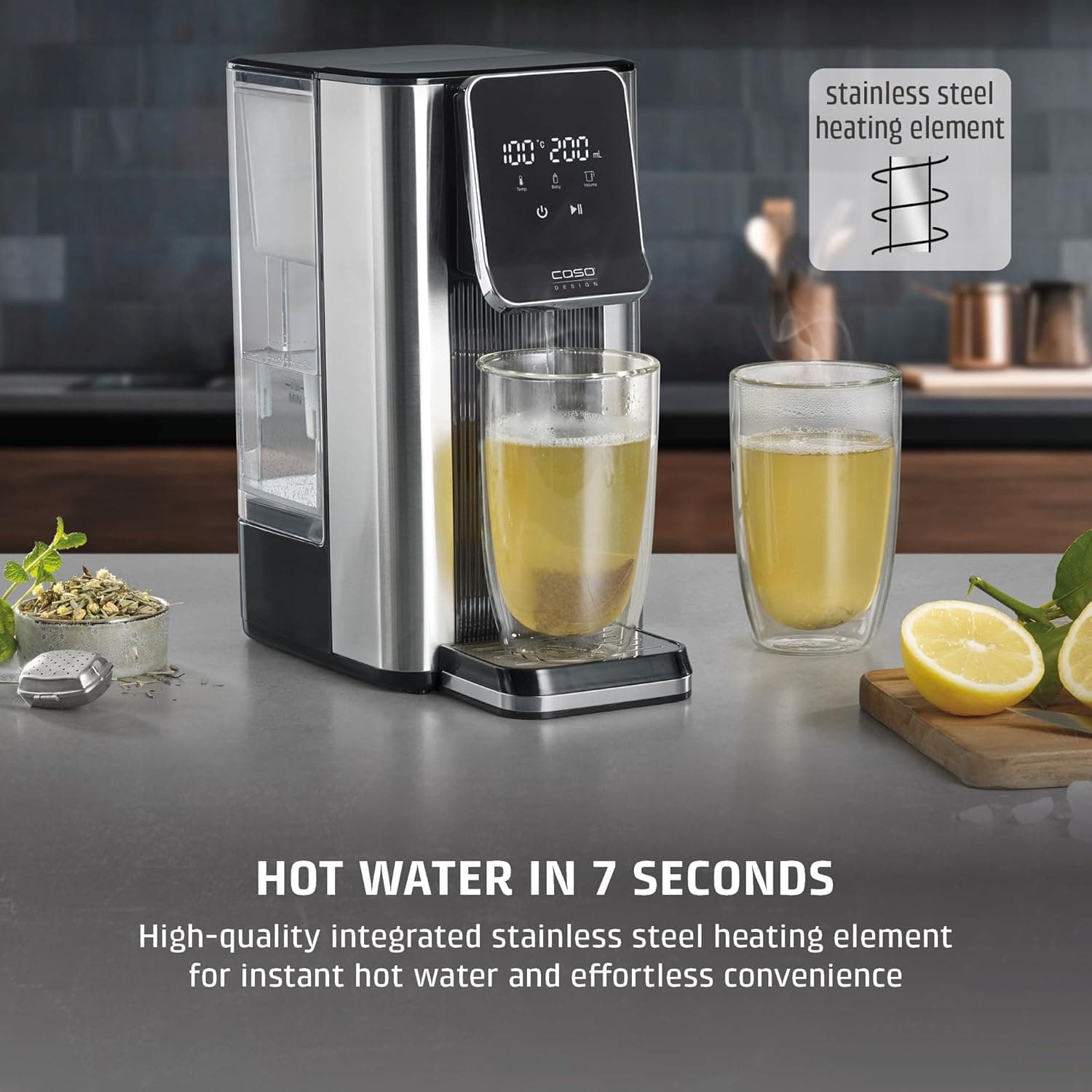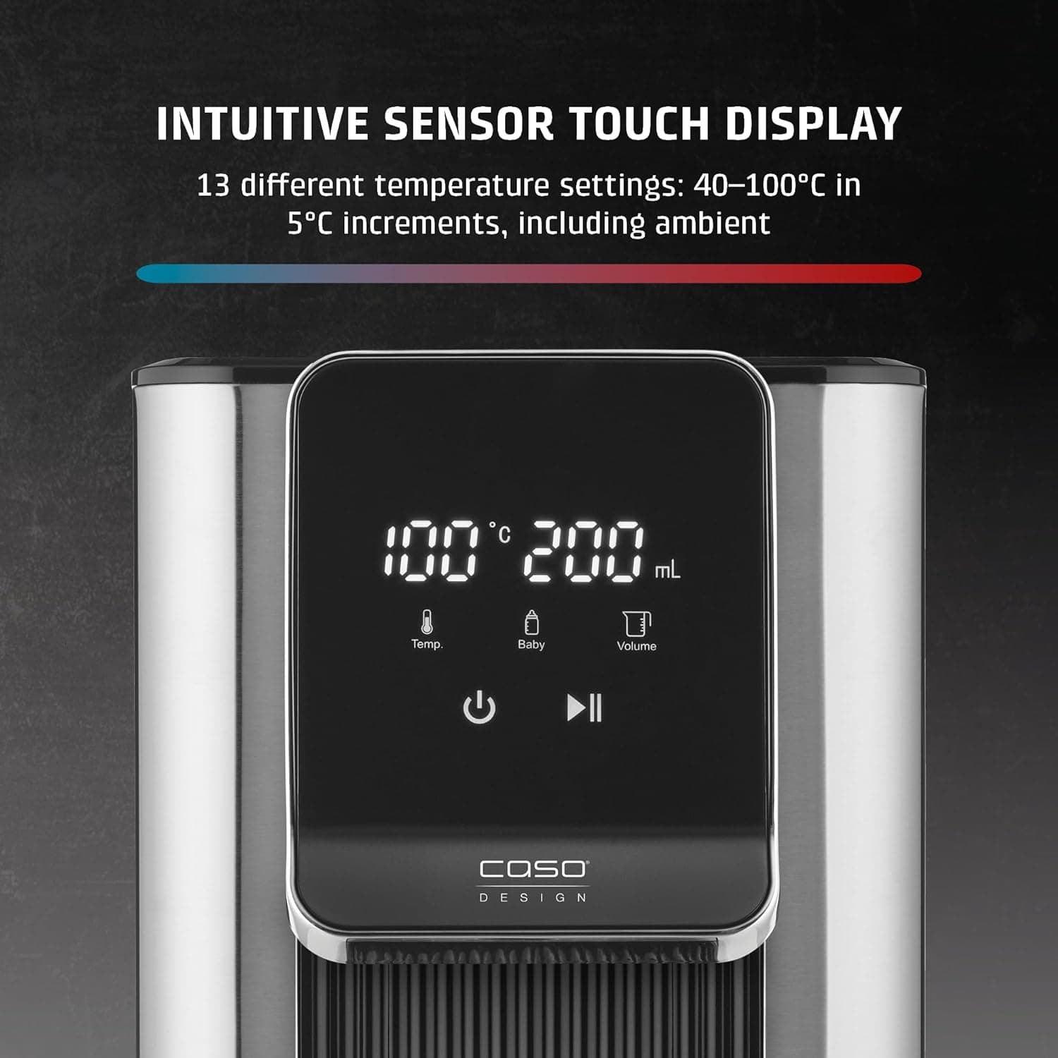 המכשיר CASO Hot 6 בעל עיצוב אלגנטי וקומפקטי, עשוי מפלדת אל חלד באיכות גבוהה עם שליטה מגע אינטואיטיבית. אידיאלי להכנת תה, קפה, משקאות חמים, פסטה ומזון לתינוקות (מים לתחליף חלב לתינוקות צריכים להיות מעוקרים קודם).