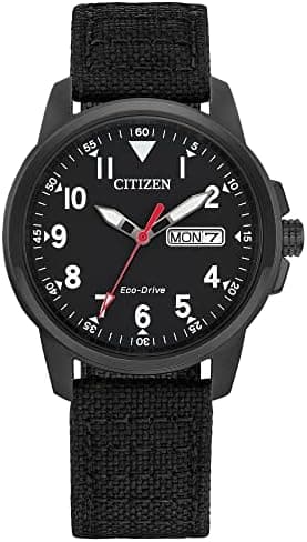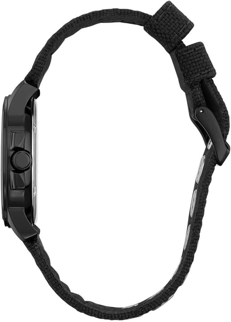 For A Rugged Look With A Comfortable Fit, This Military-Inspired Timepiece Fits The Bill. With A Day-Date Indicator, Luminous Hands, 37Mm Case, And 50 Metres Water Resistant. The Black Dial Provides A Backdrop For Simple Arabic Numerals, Housed In A Black Ion Plated Stainless Steel Case Along With A Woven Black Strap With Patterned Stitching And A Buckle Clasp.