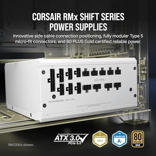 CORSAIR RMx SHIFT Series fully modular power supplies boast a revolutionary side cable interface to keep all your connections within quick reach, for exceptionally convenient 80 PLUS Gold efficient power. With fully modular micro-fit connections and ATX 3.0 compliance, RMx SHIFT makes clean PC builds and upgrades even easier. RMx SHIFT PSUs use Japanese 105°C-rated electrolytic capacitors, for long life and reliability backed by a ten-year warranty. A 140mm fluid dynamic bearing fan utilizes a specially calculated fan curve for high performance and reliability with low noise, while Zero RPM mode support ensures virtually silent operation at low and medium loads. For quiet, efficient, and accessible power, put an RMx SHIFT Series PSU on your side.