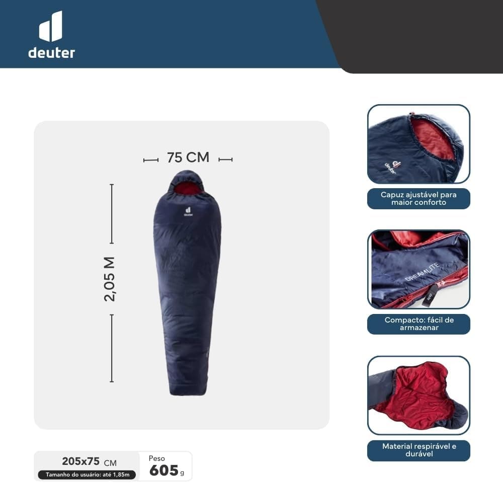 שק שינה לקיץ מדגם Dreamlite מבית Deuter, מיועד לקמפינג וטיולים בתנאי מזג אוויר חמים. מבנה מומיה קל משקל במיוחד במשקל כ־690 גרם, עם נפח אריזה קטן לנשיאה נוחה. מתאים למשתמשים עד גובה ‎200 ס״מ, כולל כיס פנימי לפריטים אישיים. דירוג נוחות לקיץ בטווח של כ־15°C.