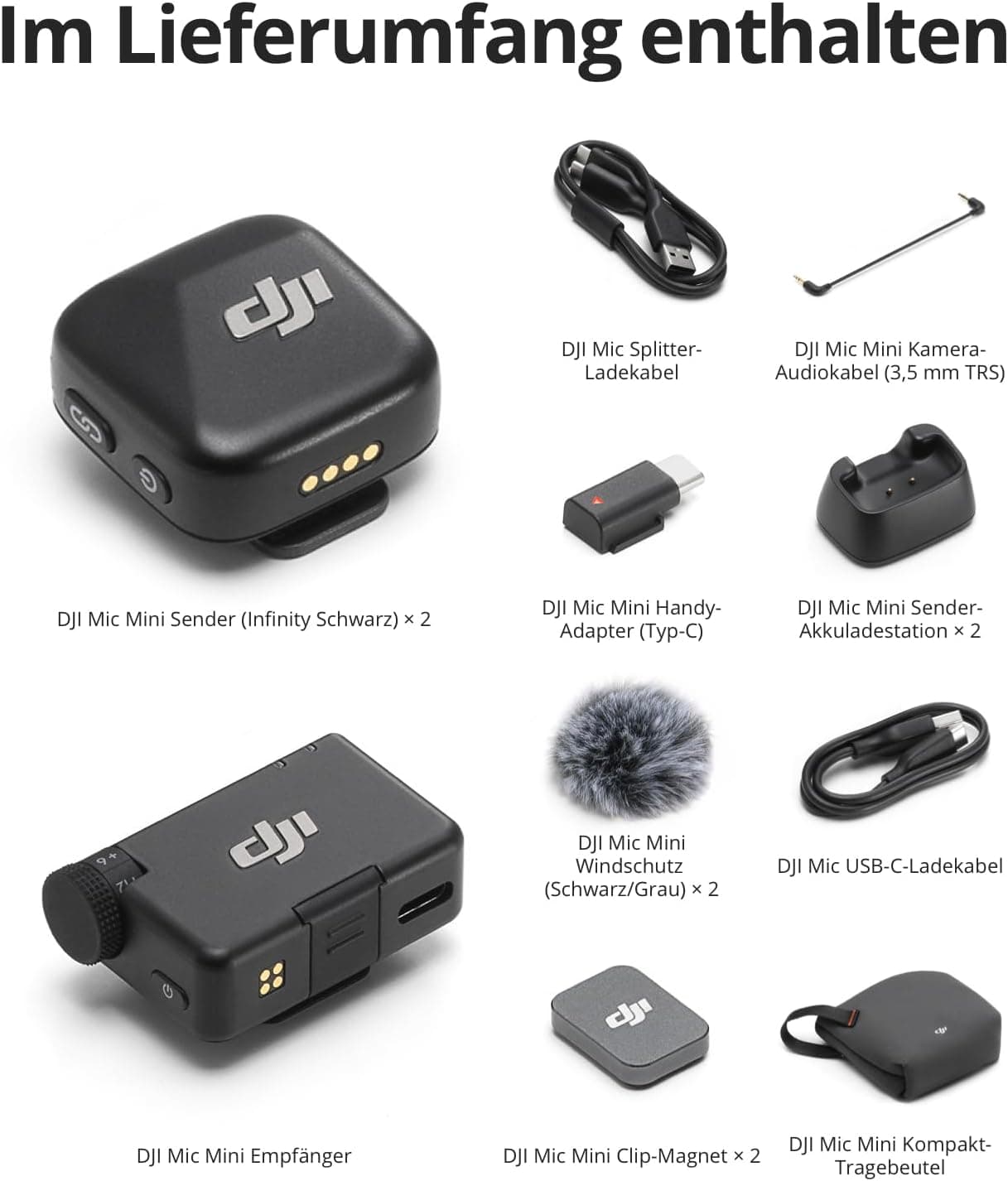 סקירה כללית DJI Mic Mini הוא מיקרופון אלחוטי קומפקטי וקל במיוחד המספק ביצועים חזקים, שידור יציב של אודיו באיכות גבוהה וחיי סוללה ארוכים. DJI Mic Mini זמין ב -5 אפשרויות רכישה: - Mic Mini (2 משדרים + מקלט אחד + עריסת טעינה) מכיל שני משדרים, מקלט ועריסת טעינה ועוד. תחנת כוח אמיתית לתרחישי הקלטה ארוכים יותר כמו ראיונות, שידורים חיים ועוד. - MIC MINI (משדר אחד + מקלט אחד) כולל משדר, מקלט ועוד. הוא אידיאלי עבור קריאייטיבים שרוצים יותר גמישות למגוון של תרחישי יצירת תוכן. - משדר DJI Mic Mini (שחור אינפיניטי) כולל משדר ואביזרים בסיסיים להקלטת סולו חלקה. - משדר DJI Mic Mini (לבן קוטב) כולל משדר ואביזרים בסיסיים להקלטת סולו חלקה. - DJI Mic Mini (2 TX + 1 RX), כולל שני משדרי DJI Mic Mini, מקלט ואביזרים אחרים.