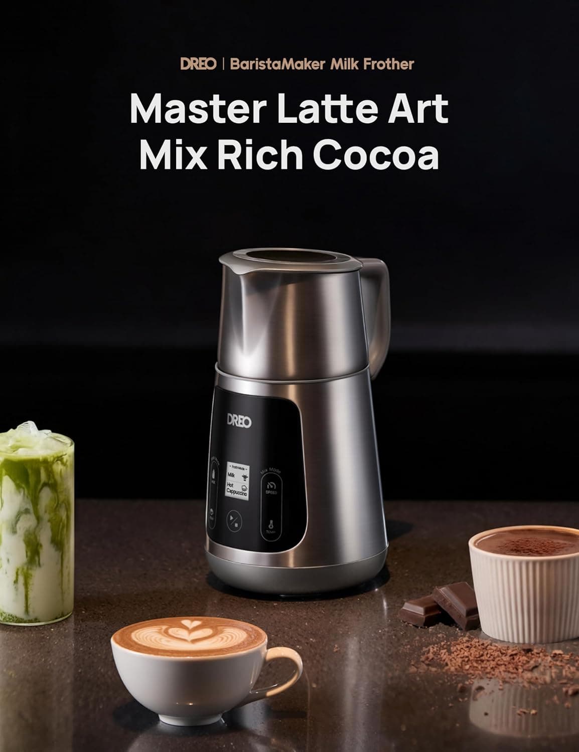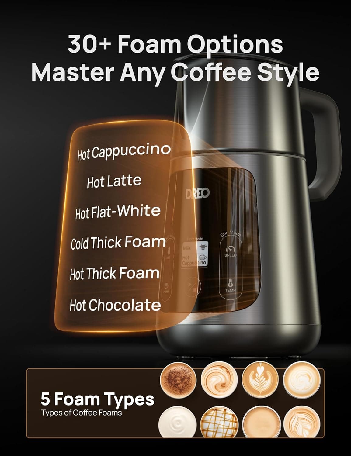 מקציף חלב מתקדם מבית Dreo – פתרון All-in-1 להכנת מעל 30 סוגי משקאות, כולל לאטה, קפוצ’ינו ושוקו חם עשיר.