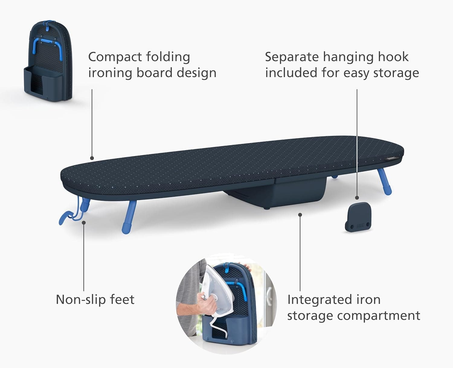 Discover the ultimate ironing convenience with our Joseph Joseph Folding Tabletop Ironing Board. Perfect for those with limited storage or the need for quick touch-ups, our board redefines compact ironing. It not only folds neatly in half for easy storage but also includes a dedicated hanging hook for wall or door mounting, ensuring it's always within reach yet out of the way. Our innovative design doesn't stop there; it features a built-in iron storage compartment to streamline your ironing setup, keeping everything you need in one convenient location. Quick to set up with its fast-release locking toggle and sturdy, non-slip folding legs, it provides a stable and generous ironing surface for all your garments. The board is equipped with a state-of-the-art, multi-layer cover featuring DripLock Technology. This technology consists of a 100% cotton top layer with a thick felt padding underneath for ultra-smooth ironing, topped off with a waterproof base layer to catch excess water. Its elastic edges make the cover easy to change, ensuring a snug fit, and replacement covers are readily available. Designed to cater to larger volumes of ironing or use with steam generator irons, our ironing board delivers unparalleled efficiency. With a frame guaranteed for 5 years against manufacturing defects, it represents not just an ironing board, but a revolution in your household chores. Replacement covers are also available.