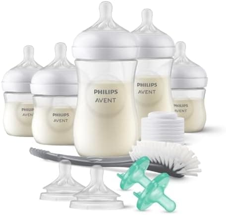 A perfect starter set for new parents. Philips Avent Natural bottles with Natural Response nipple lets baby control the pace of the milk, like they do when breastfeeding. The nipples' unique opening and tip only releases milk when your baby actively drinks. When pausing to swallow and breathe no milk flows. Baby can drink, swallow, and breathe using their natural rhythm, just like they do when breastfeeding. Easily combine breast and bottle feeding with a wide breast-shaped nipple with a soft feel that mimics the shape and feel of a breast; plus baby controlling the flow of milk. A bottle brush with a curved brush head for easy cleaning of rounded bottle edges and a molded tip to clean the nipple. Sealing discs to covert the bottle into a storage container. Soothie 0-3M pacifier, Soothie Pacifiers are used by medical professionals to calm newborns, the durable pacifiers features hospital grade silicone and one piece construction. The Natural bottle is made from polypropylene, a BPA free material, and works with all nipples and caps from the Natural line. The Natural response nipples come in flow rates 1-5. Includes: 3 4oz Natural bottles with Natural response nipples flow 2, 2 9oz Natural bottles with Natural response nipples flow 3, 1 Natural Response nipple, flow 1, 1 Natural Response nipple, flow 4, 7 sealing discs, 2 Soothie pacifiers 0-3 months, 1 bottle brush. SCD838/02 What to expect when introducing the Philips Avent Natural Response Nipple It is totally natural for your baby to take 2-3 tries to get milk flowing from a new bottle. Unlike traditional bottles the Natural bottle is designed to only release milk when your baby is actively drinking, like what happens when babies breastfeed. We have 5 different nipple flow rates for the Natural bottle. When looking for the right nipple flow rate, age is a guide, but your baby's approach to drinking and the feeding cues they will show will help determine when to move to a higher or lower nipple flow rate.