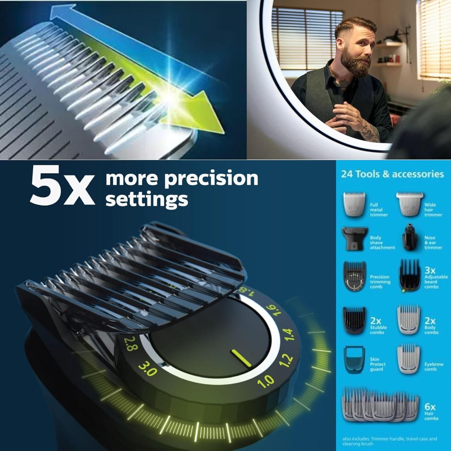 השיגו את המראה הטוב ביותר שלכם עם סדרת Philips Norelco Multigroom 9000. פתרון טיפוח All - in - One זה, שתוכנן עבור הרבגוניות האולטימטיבית, מציע דיוק וביצועים ללא תחרות עבור הפנים, הראש והגוף שלך. בין אם אתה גוזם את הזקן שלך, מעצב את השיער שלך, או מטפח את שיער הגוף שלך, הוא מספק את הכלים והתכונות הדרושים לך למקצוע לגלות את פתרון הטיפוח המלא שלך עם Philips Series 9000 All - in - One Trimmer, שתוכנן לדיוק מקסימלי מכף רגל ועד ראש. בין אם אתם מעצבים זקן, גוזמים שיער, מפרטים קצוות או מטפחים את גופכם, ערכת פרימיום זו מספקת תוצאות מקצועיות בבית. עם 24 קבצים מצורפים באיכות גבוהה, אתם מקבלים את כל מה שאתם צריכים: מסרקים זיפים, מסרקים מתכווננים לשיער (3 -20 מ"מ), מסרקים דועכים, מסרקים לגוף, מגלח גוף עם מגן עור, גוזם שיער רחב במיוחד, גוזם אף ואוזן, מסרק גבות ועוד. מסרק הגיזום המדויק מאפשר התאמות אורך מדויקות במיוחד עד 0.2 מ"מ צעדים לפירוט מושלם. מופעל על ידי טכנולוגיית BeardSense, הגוזם מסתגל בצורה חכמה לצפיפות השיער שלך ומספק כוח עקבי לקצץ אחיד במעבר אחד. להבי הפלדה המשחיזים את עצמם נשארים חדים במשך שנים ללא שימון או תחזוקה. עמיד למים לחלוטין ומצויד בסוללת ליתיום - יון עוצמתית של 120 דקות, גוזם זה בנוי לנוחות, צדדיות וביצועים לאורך זמן. מגובה באחריות של פיליפס ל -5 שנים, זהו פתרון הטיפוח האולטימטיבי לשימוש יומיומי. תוצאות אנאליות בבית.