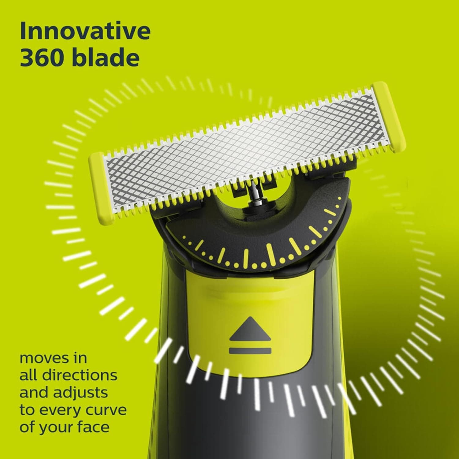 הפיליפס נורלקו OneBlade מציע טכנולוגיה מהפכנית שנועדה לעיצוב פנים וטיפוח גוף. הוא יכול לקצץ, לעצב ולגלח כל אורך שיער. הטכנולוגיה הייחודית של OneBlade משלבת חותך מהיר (12,000 פעמים בדקה) עם מערכת הגנה כפולה כדי להעניק לך גילוח יעיל ונוח על שיער ארוך יותר. הלהב החדשני 360 יכול להתגמש בכל הכיוונים.