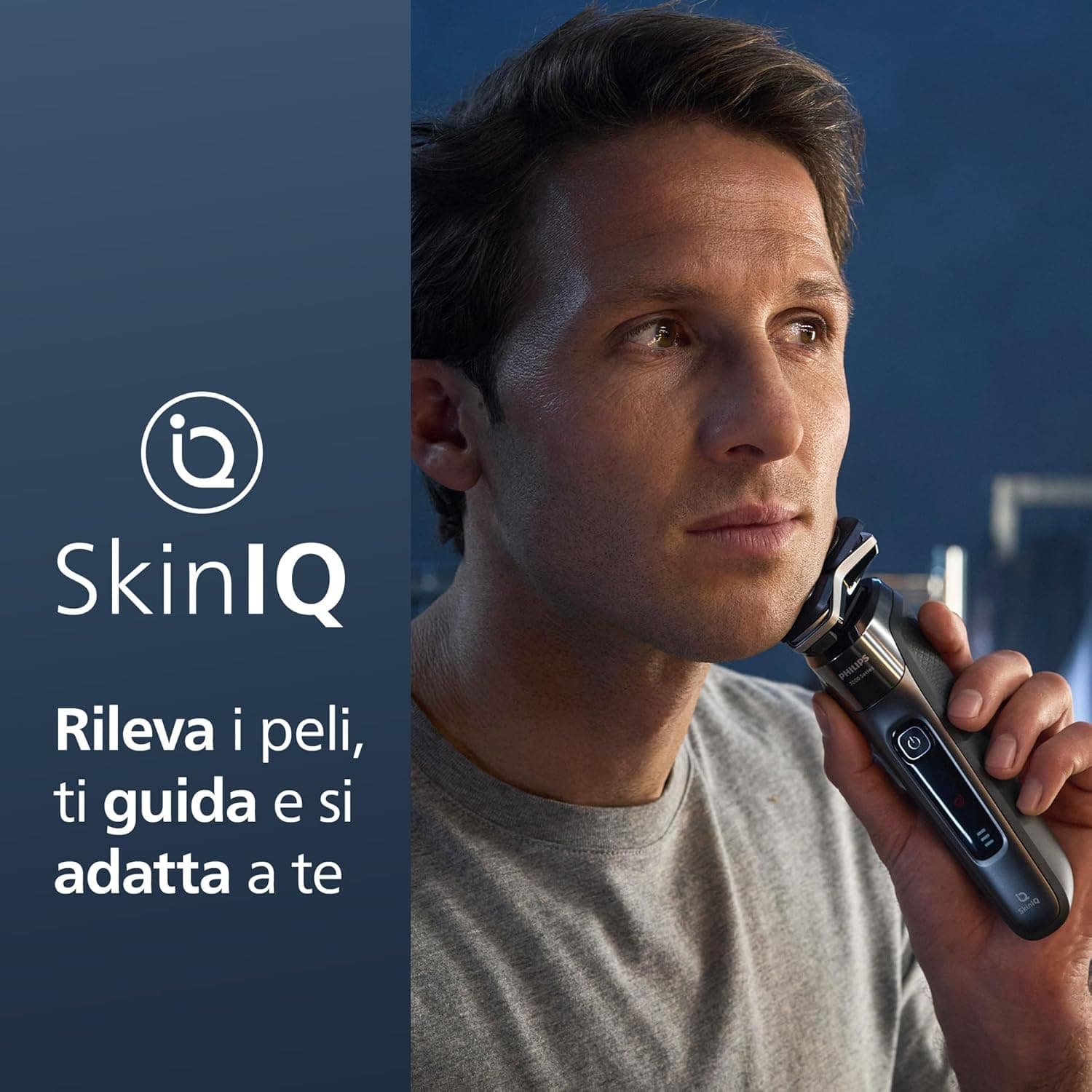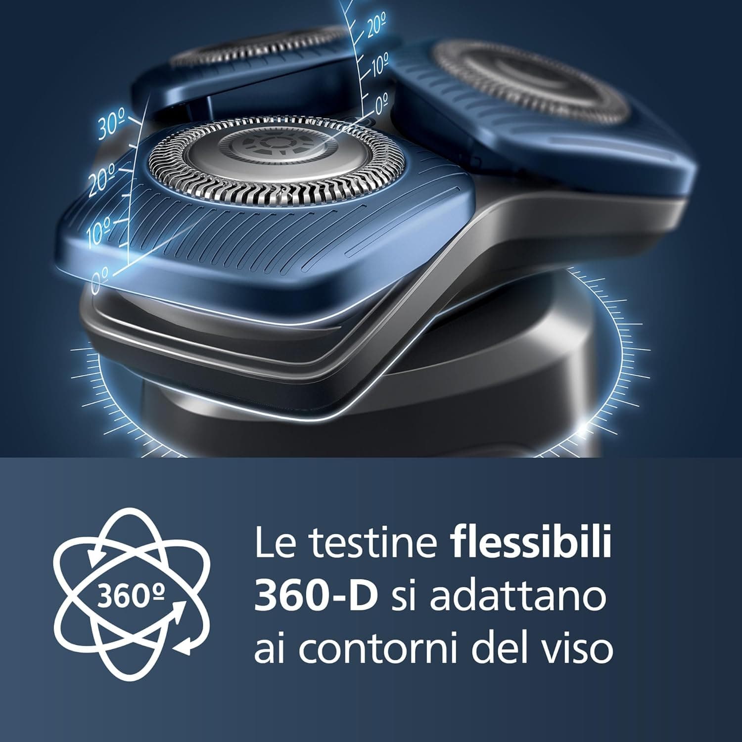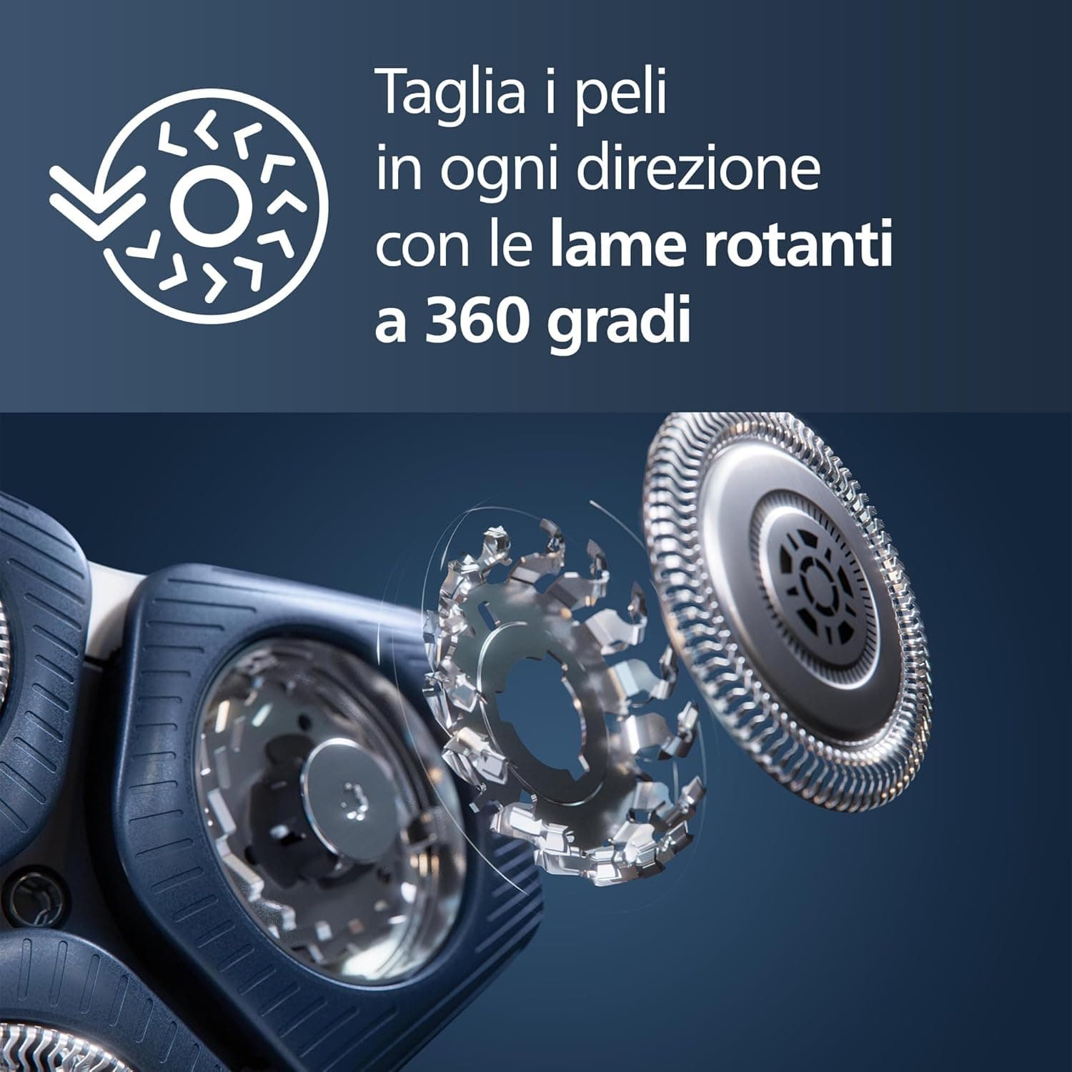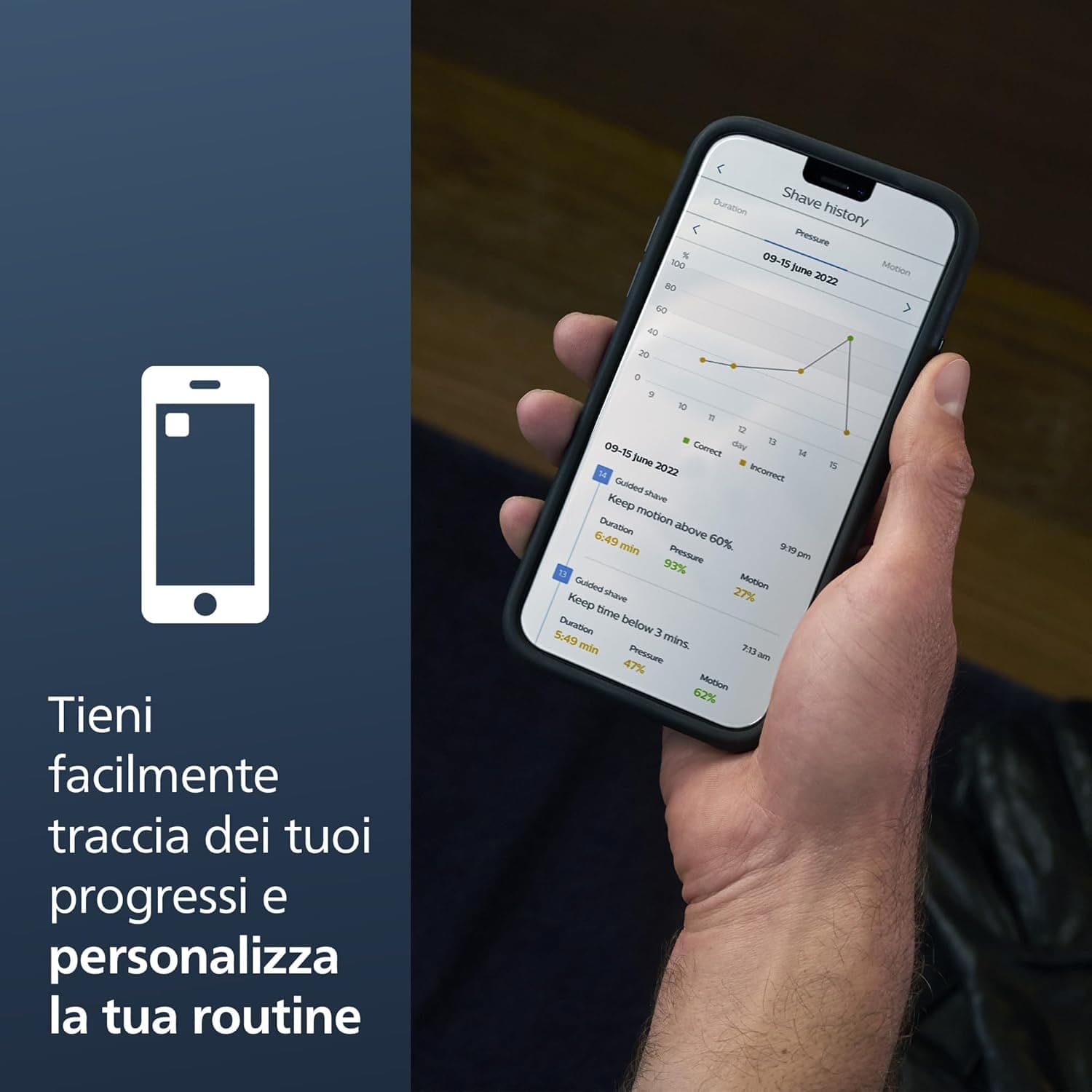 Descrizione From the world's #1 electric razor brand****: The Philips Series 7000 shaver glides smoothly across the skin and cuts every single hair, even 3-day beards. A protective coating is located between the razor heads and the skin. With up to 90,000 cutting actions per minute, SteelPrecision blades shave closely, cutting more hair per stroke*. The 45 high-performance blades are self-sharpening and made in Europe. Motion detection technology follows the way you shave and guides you to a more efficient technique***. Perfect your shave by pairing your razor with the Philips GroomTribe app. Track your skin's progress, customize your shave and master your technique. Smart facial hair sensor reads hair density 250 times per second. The technology dynamically adapts the cutting power for a gentle and effortless shave. Fully flexible heads rotate 360° to follow the contours of your face. The new shape of the shaving heads is designed to ensure accuracy. The surface is enhanced by hair guide channels, designed to move the hair to an effective cutting position. Just press a button to open the shaver head and rinse with water. With Wet & Dry, you can choose between a comfortable dry shave or a refreshing wet shave. You can shave with gel or foam even in the shower . Complete your look with the retractable precision trimmer on the razor. Integrated into the body of the razor, it is the ideal way to treat your moustache and trim sideburns. The motor and battery of our razors are designed to last, with long-lasting power for a powerful shave. USB adapter not included. *Tested against Philips Series 3000 **against uncoated material ***Based on Philips Series S7000 and GroomTribe app users in 2019. ****Euromonitor International Limiter Retail Value by Body Razor Category Definition Data 2022 Research conducted in December 2022 Indicazioni 1. Charge the shaver fully before first use. 2. Open the shaving head and place the beard hair inside. 3. Turn on the razor and gently move it across the skin in circular motions. 4. Turn off and clean the razor after use. P.when('A').execute(function(A) { A.on('a:expander:toggle_description:toggle:collapse', function(data) { window.scroll(0, data.expander.$expander[0].offsetTop-100); }); }); Avviso di sicurezza Keep away from children See more