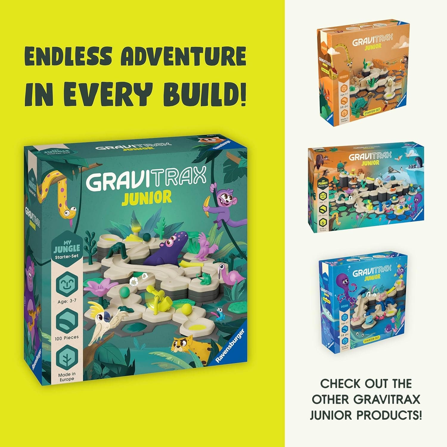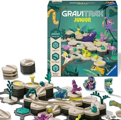 Unlock a world of creativity and critical thinking with the GraviTrax Junior - My Jungle Starter Set from Ravensburger, part of an award-winning STEM educational toy system designed to challenge young minds. This marble-powered gravity and kinetic logic activity blends problem-solving, engineering, and hands-on learning into an exciting, screen-free experience. With progressive challenges, kids can build pathways for the marbles to travel through the jungle they build of gravity-powered layouts, refining their spatial reasoning, problem-solving skills, and strategic thinking along the way. Perfect for children ages 3-5, 4-6, 5-7, and up, this comprehensive kit includes 100 pieces with everything they need to construct an exciting jungle, complete with vegetation and figurines. An excellent choice that encourages independent thinking, patience, and persistence. Fun and thrills are unlimited - as your child grows, so does GraviTrax - add expansion sets for even more intricate and complex layouts. With a trusted reputation in educational games, Ravensburger has sold over 50 million brain-challenging puzzles and games worldwide, making GraviTrax a top choice among parents, teachers, and homeschoolers alike. Whether as a birthday gift, STEM classroom activity, or family game night favorite, this fun and educational marble run will keep kids engaged while fostering real-world engineering skills.Recognized with MESH Accreditation, this product excels in supporting key skills and has earned very high ratings in Problem Solving, Perseverance, Adaptation, and Cognition, and high ratings in Conflict Resolution, and Self-Advocacy.