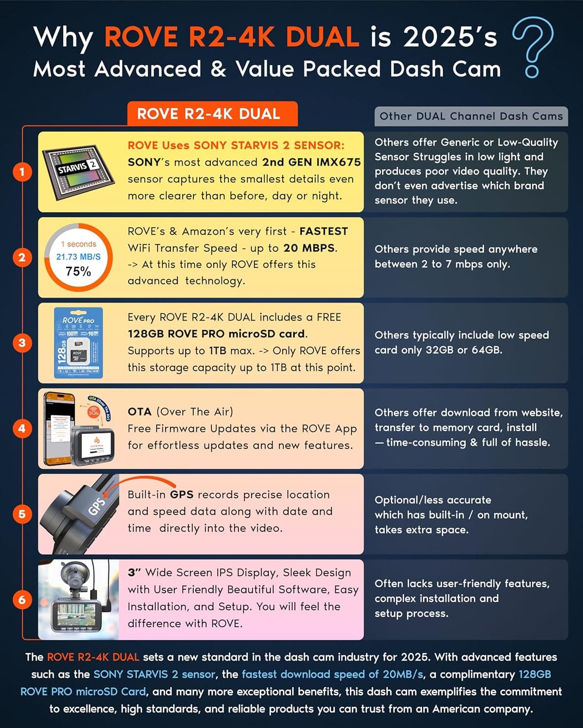 ROVE R2-4K DUAL מצלמת רכב קדמית ואחורית, חיישן STARVIS 2, כרטיס 128GB מתנה כלול, WiFi 5G - עד 20MB/s מהירות הורדה המהירה ביותר עם אפליקציה, מצלמת רכב 4K 2160P/FHD, 3" IPS, מצב חניה 24 שעות