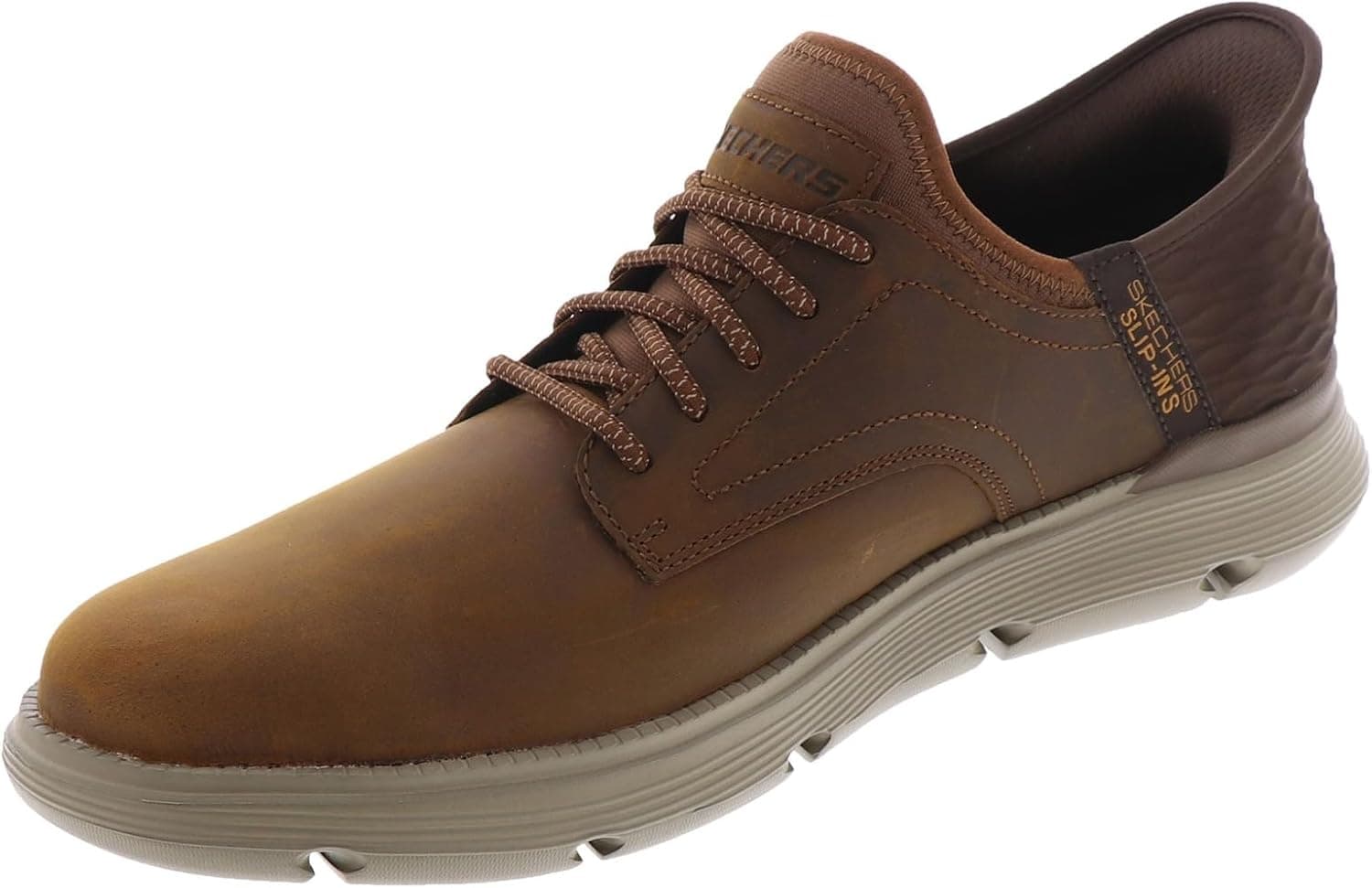שפר את היעילות שלך עם מראה עסקי נוח בעזרת נעלי Skechers Hands Free Slip-ins®: Garza - Gervin. סגנון אוקספורד TOUCHLESS FIT® ברוחב רחב זה כולל עליון מעור חלק עם שרוכים אלסטיים, פאנל עקב מעוצב של Skechers Slip-ins®, סוליית זיכרון Skechers Air-Cooled Memory Foam® עם פחם, ו-Skechers Goga Mat Arch™ לתמיכה נוספת.