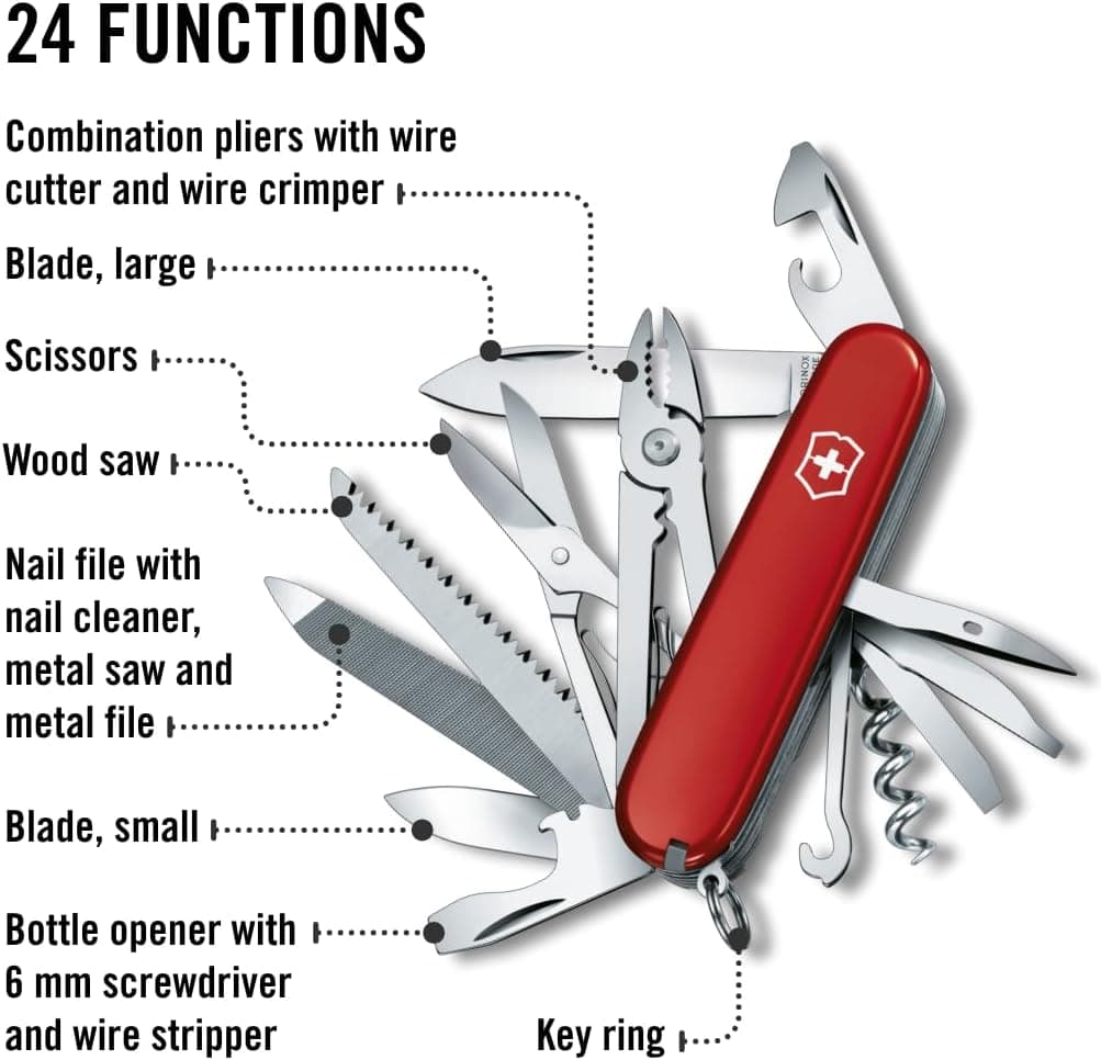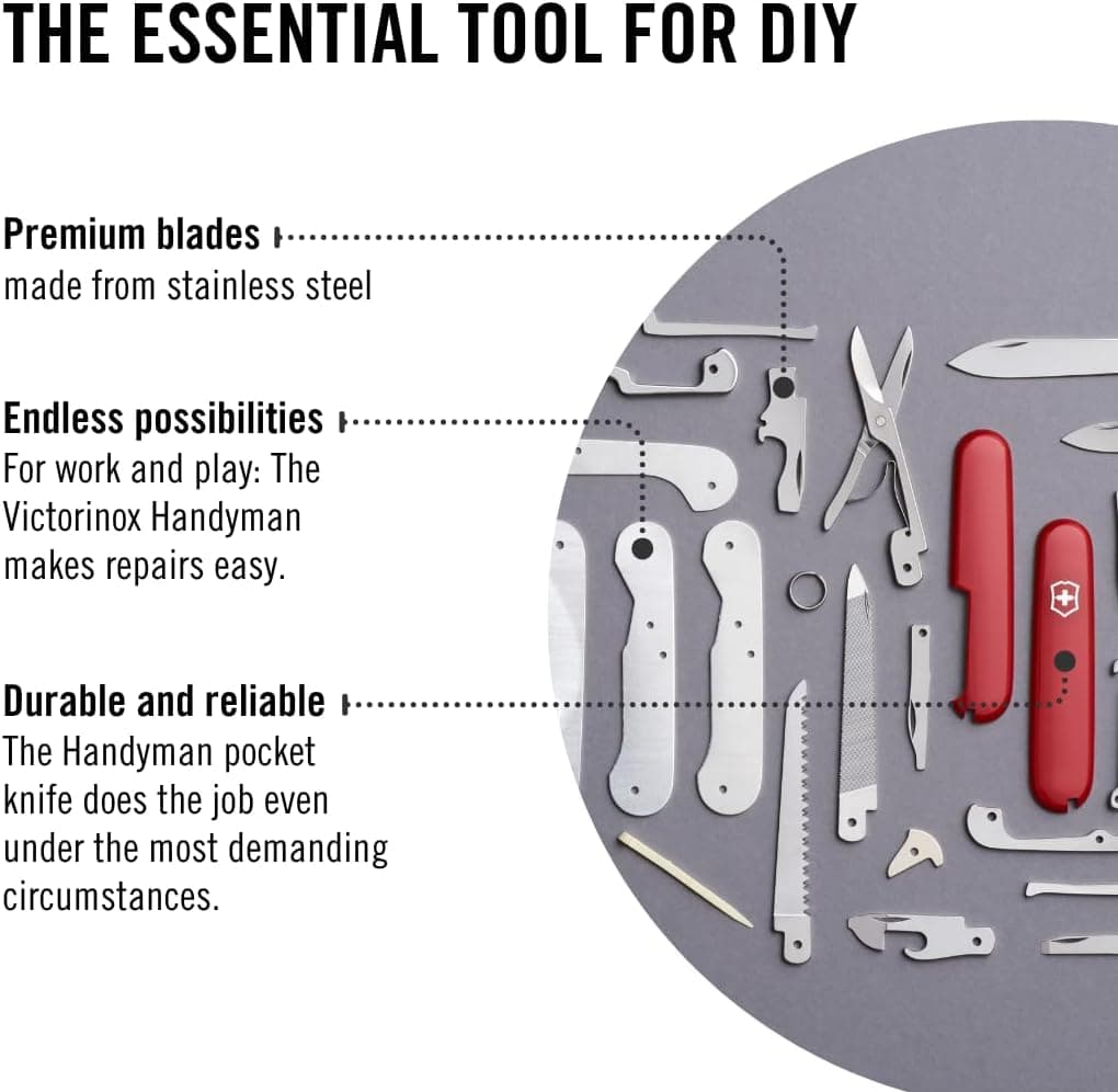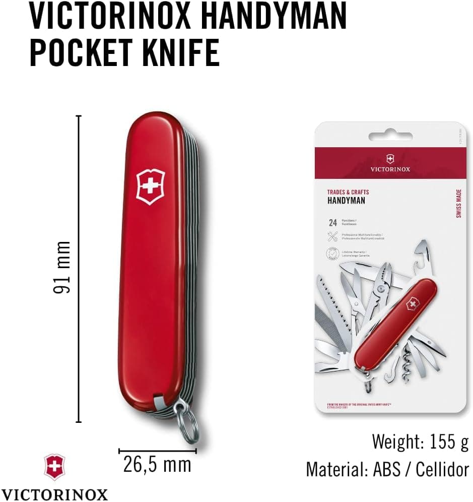 אולר מולטיטול שווייצרי Victorinox Handyman עם 24 פונקציות הכוללות פלאייר, מפסלת, מסור מתכת, מסור עץ, מספריים ולהב גדול לדיוק בחיתוך. מידות: אורך 91 מ"מ, רוחב 26 מ"מ, גובה 28 מ"מ. משקל: 155 גרם. מיוצר בשווייץ מחומרי ABS/Cellidor בצבע אדום.